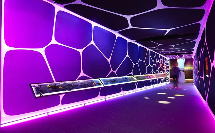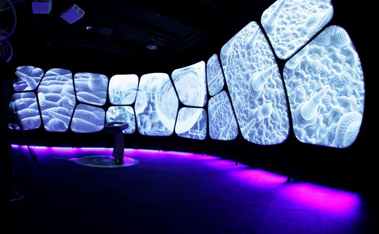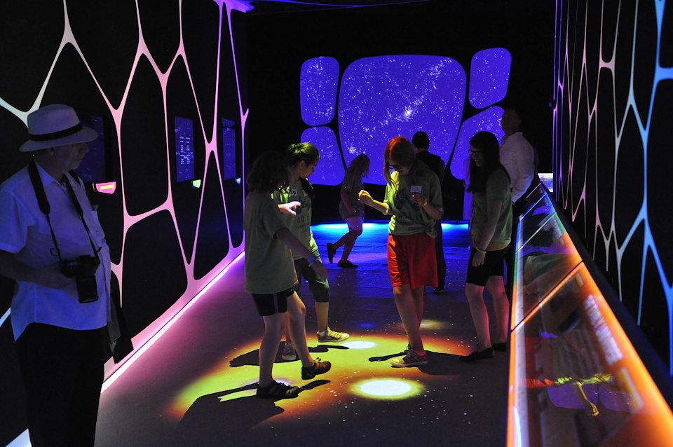 The gallery includes gesture-based interactive floors, a periodic simulated big bang with shaking floors and animated lights, and innovative projection techniques.