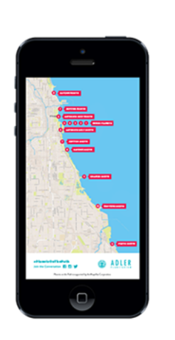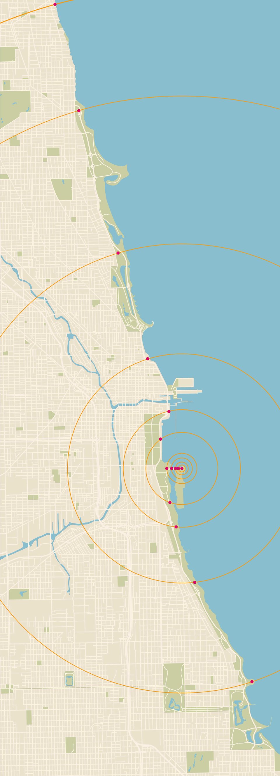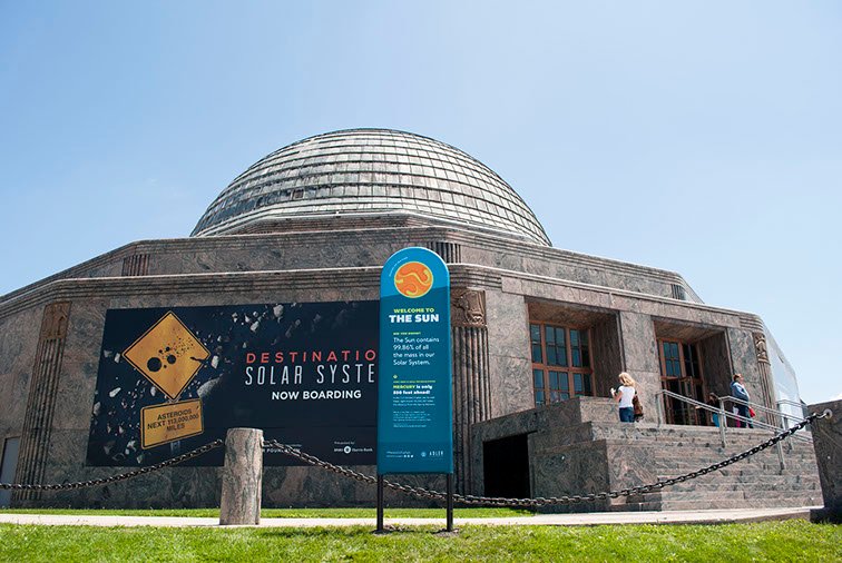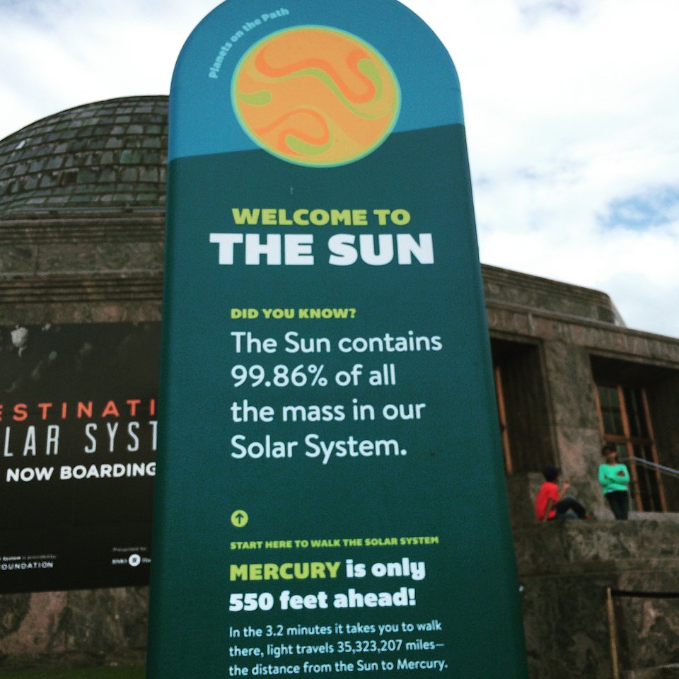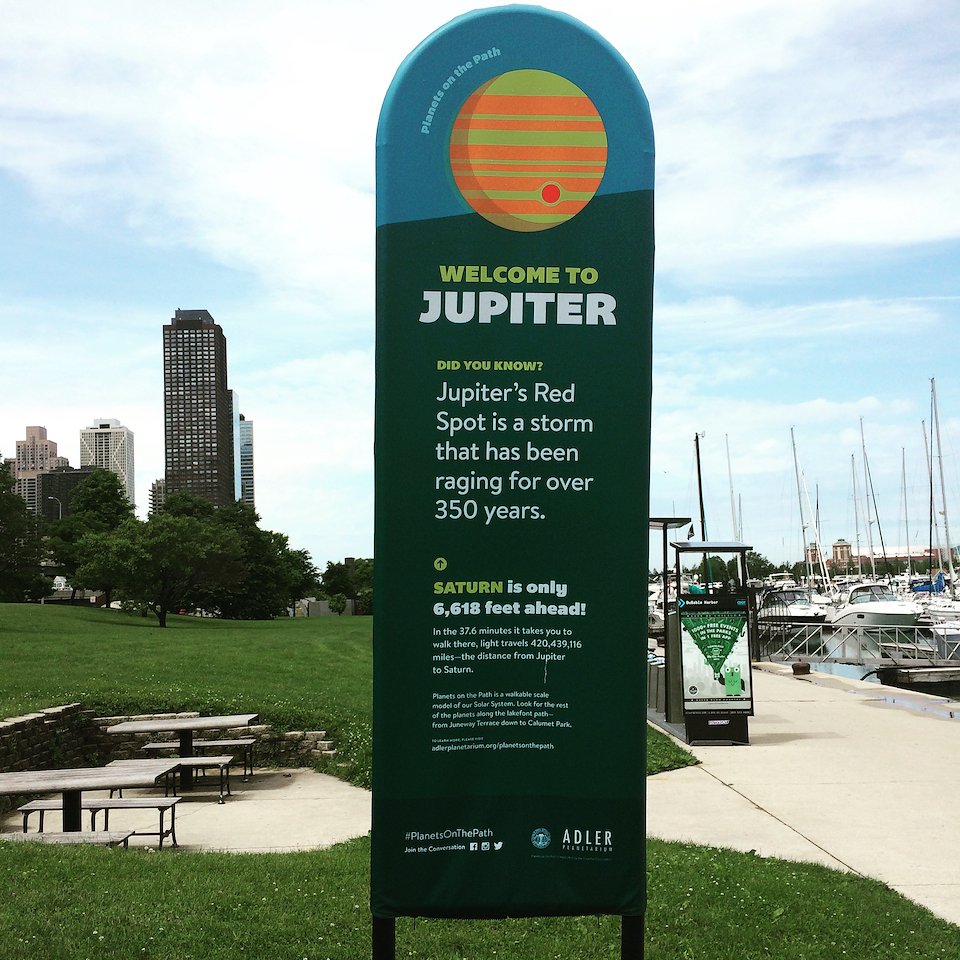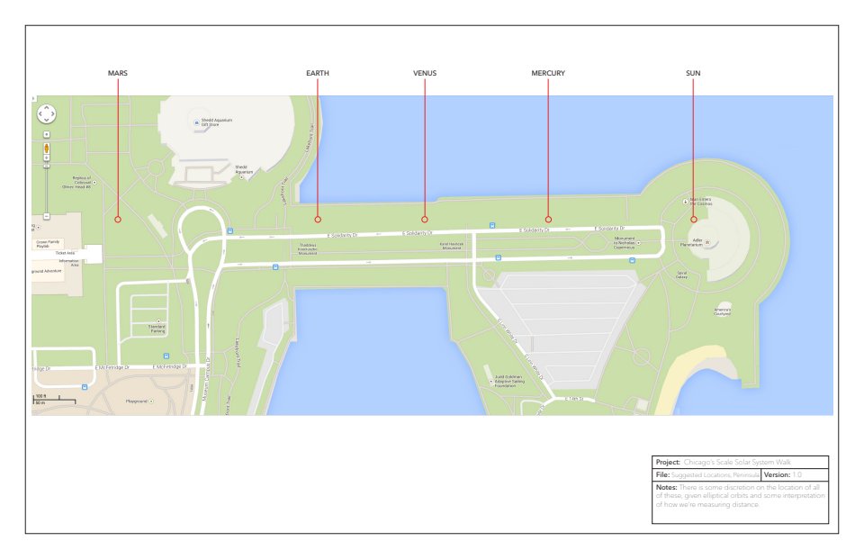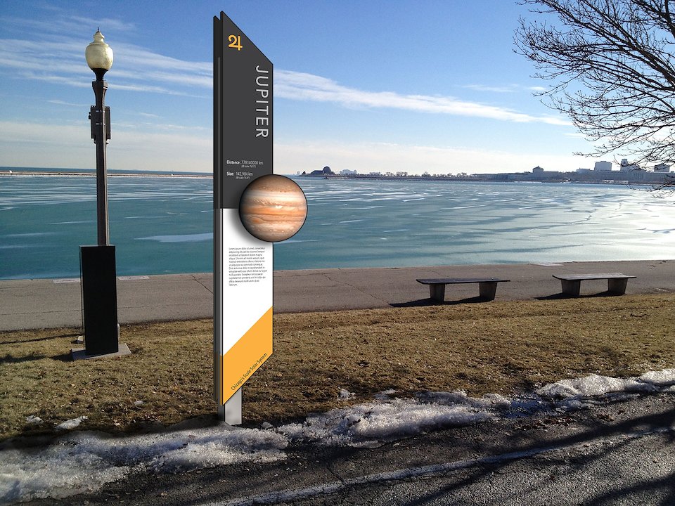 This scale model of the solar system stretched along the lake front from Evanston in the north to the Indiana Border in the south, with the Adler at the location of the sun (planets were placed on both the north and south approaches along their “orbit”). Navigating the installation along the bike path gave visitors a true sense of the massive scale of the solar system and the relatively small scale of the planets in comparison to their orbits.