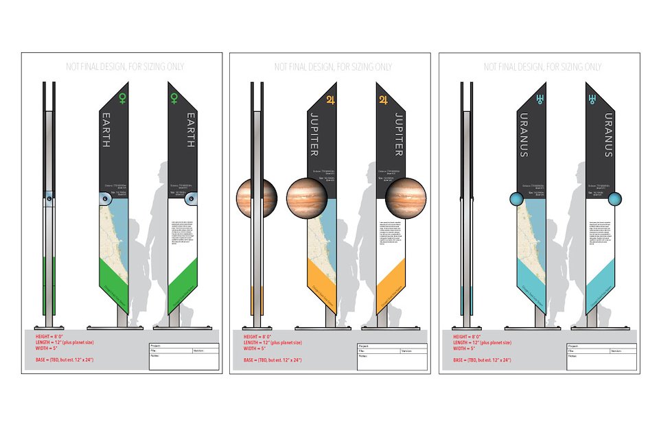 A companion GPS-based app gave additional audio information as bikers approached planets. It was originally conceived as a permanent installation, but final implementation was with more temporary materials.
