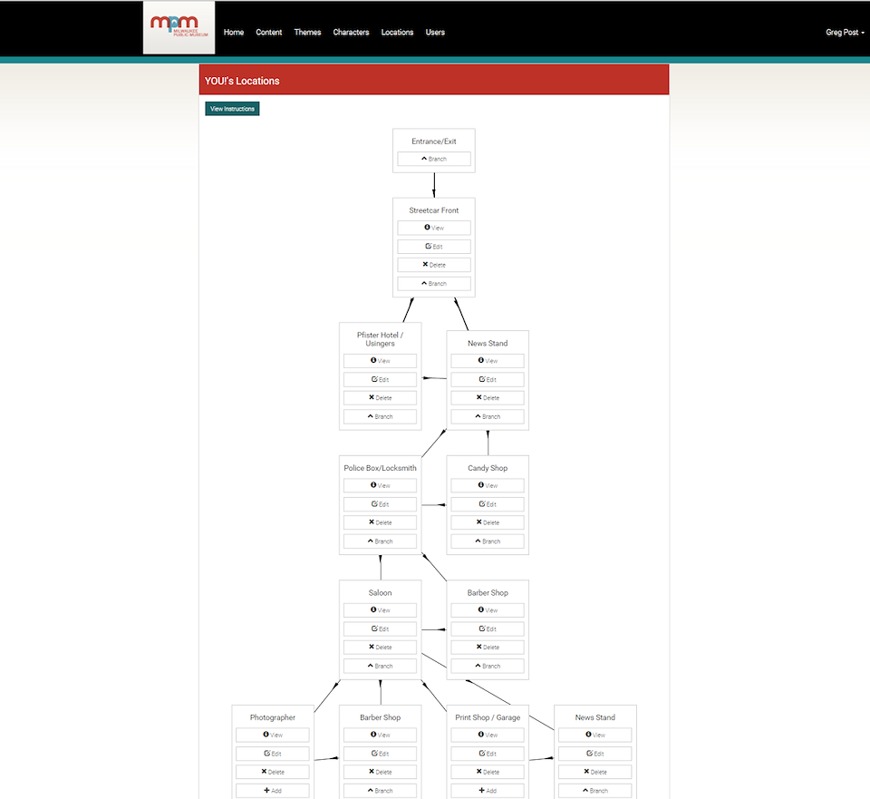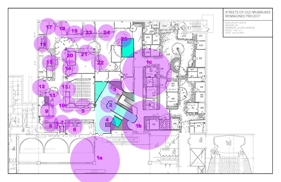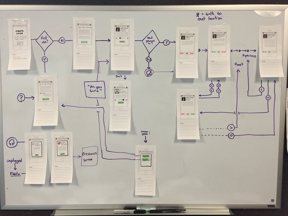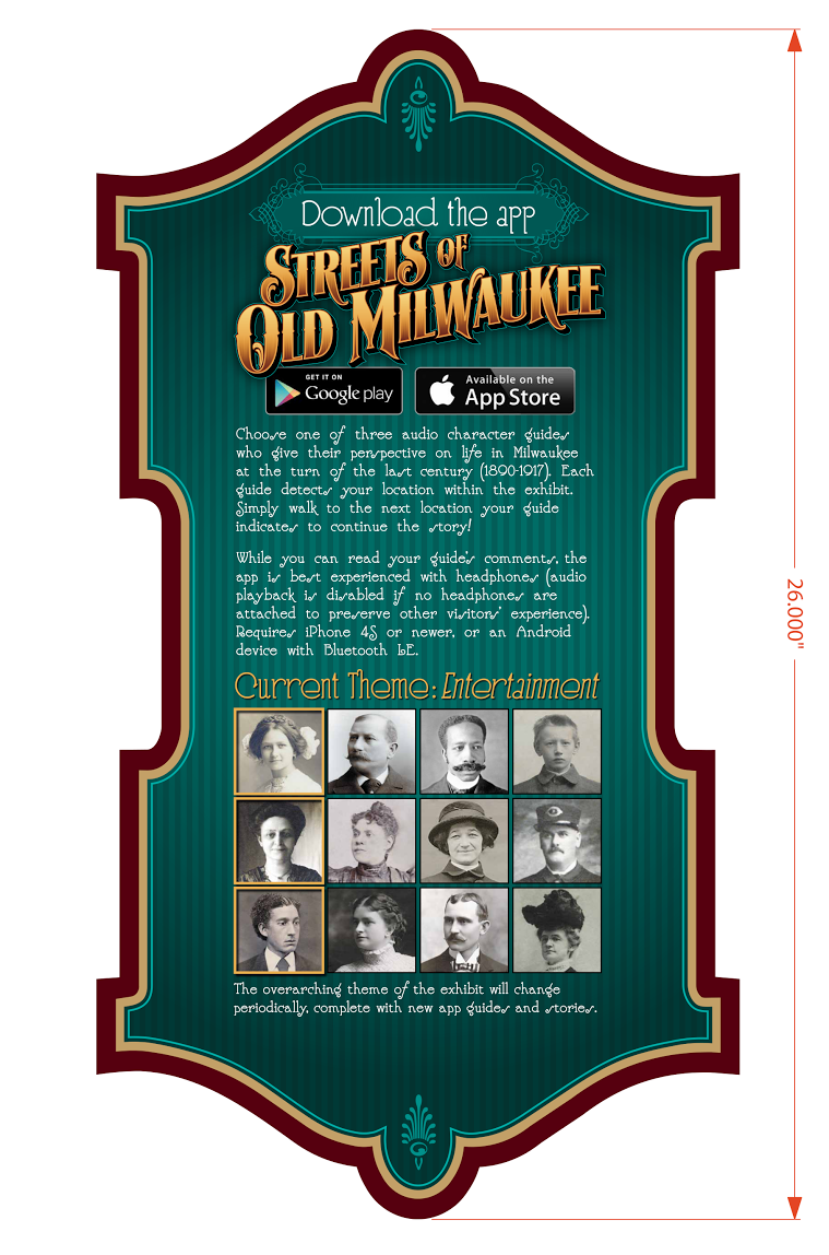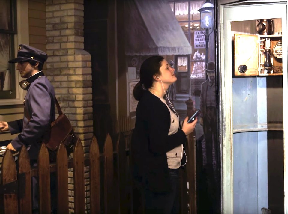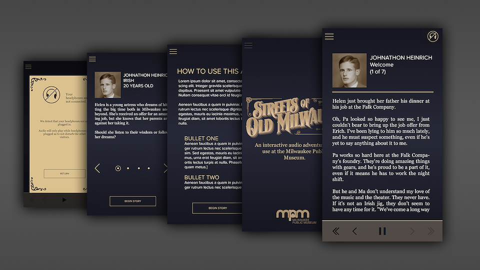 This custom choose-your-own-adventure style audio app allows the visitor to participate in multiple stories and affect the outcome by where they go in an exhibit without disturbing the experience of other visitors. Bluetooth hotspots trigger audio files as a visitor walks into the area covered. A custom content management tool allows the creation of logic to the storyline- essentially, the story path changes depending on where the visitor chooses to walk. In the Streets exhibit, this allowed us to quickly switch out the themes of the exhibit (Entertainment, Public Health, Public Safety and Immigration) and explore those themes from multiple view points (Visitors chose a person to walk the Streets with).